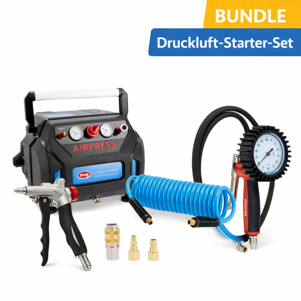 Mit dem Airpress Druckluft-Starter-Set XL erhältst du ein komplettes, sofort einsatzbereites Druckluft-System für typische Anwendungen rund um Fahrzeug, Werkstatt und Serviceeinsätze.