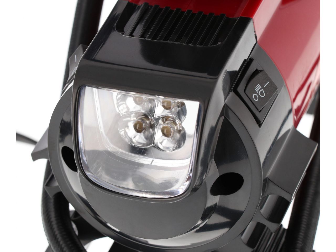 This mini compressor from Airpress is particularly useful in the car and on vacation. You can connect the compressor using the 12-volt plug that fits into your car’s cigarette lighter. With the cable of up to 3 meters, you can easily reach your children’s tires, air mattresses or soccer balls. There is a large lamp in front of the compressor that you can use to illuminate the area in the dark in the event of a breakdown. The compressor weighs 1.3 kg and has an effective capacity of 27 liters per minute. This small compressor is great for storing in the trunk near the spare tire.