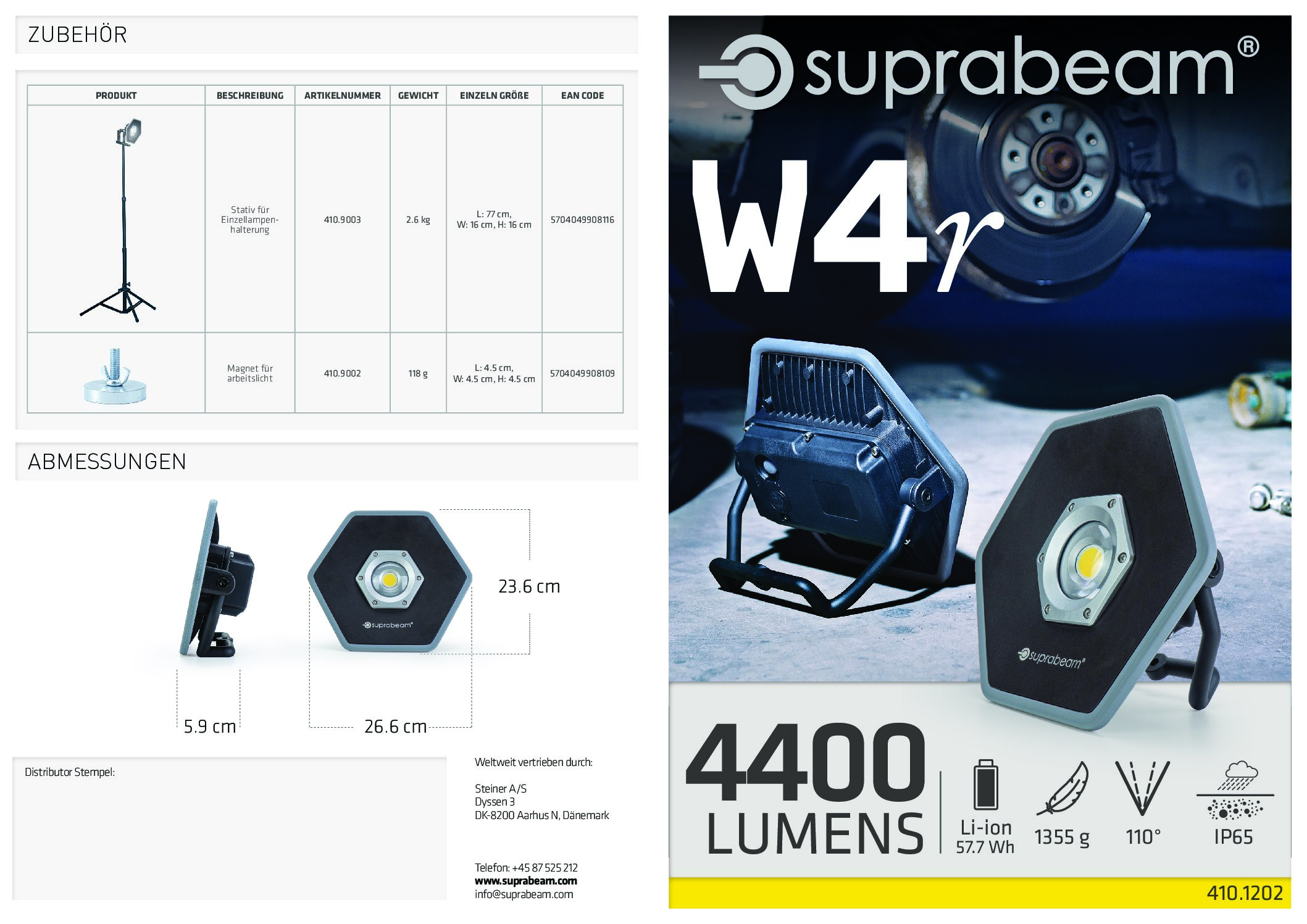 Die W4r ist ein leistungsstarkes, robustes und vielseitiges Arbeitslicht, mit dem eine ganze Wand problemlos beleuchtet werden kann. Die W4r besteht aus Aluminium und einer besonders starken Kunststoffzusammensetzung und ist für ein Leben auf der Baustelle oder in der Werkstatt ausgelegt. Die hohe Qualität der Materialien und der Konstruktion ist spürbar. Mit dem Gummirand ist die W4r vor Schlägen geschützt, die bei der Arbeit auftreten können. Das flexible Design ermöglicht es mit der W4r in jede Richtung zu leuchten. Der Lichtwinkel von 110 ° ermöglicht es, einen großen Bereich zu beleuchten. Die W4r kann im angeschlossenen Zustand verwendet werden, so leuchtet sie stundenlang während der Akku geschont wird.