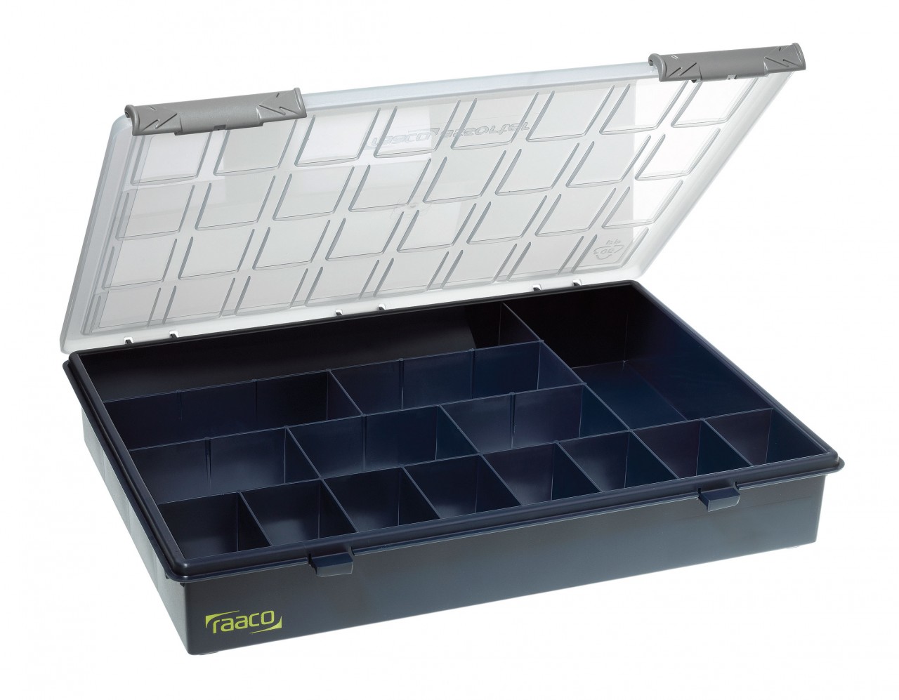 Sortimentskasten mit 15 festen Einteilungen unterschiedlicher Größe, inkl. Schiebeverschlüssen. Sicherungsprofile im Deckel verhindern ein Verrutschen des Inhalts.Hergestellt aus PP.