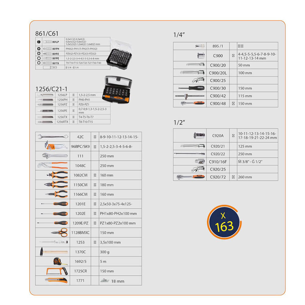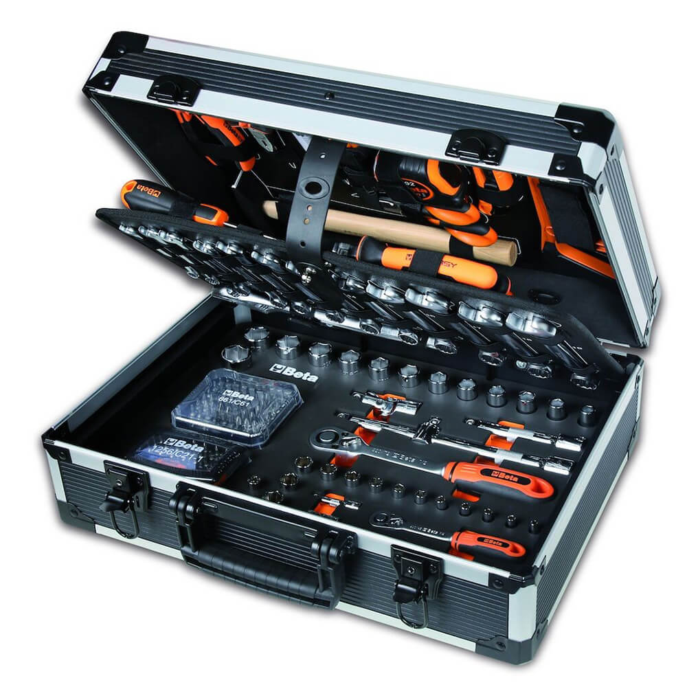 Der sehr umfangreiche und gefüllte Werkzeugkoffer von Beta (2056E) umfasst 163 Stück. Der Werkzeugkoffer enthält Werkzeuge wie Ringschlüssel, Inbussätze, Zangen, Schraubendreher, Steckschlüssel und mehr. Mit diesem Case können Sie sofort loslegen. Der große Vorteil des Werkzeugkoffers ist, dass er nur 11 kg wiegt und einiges aushält.