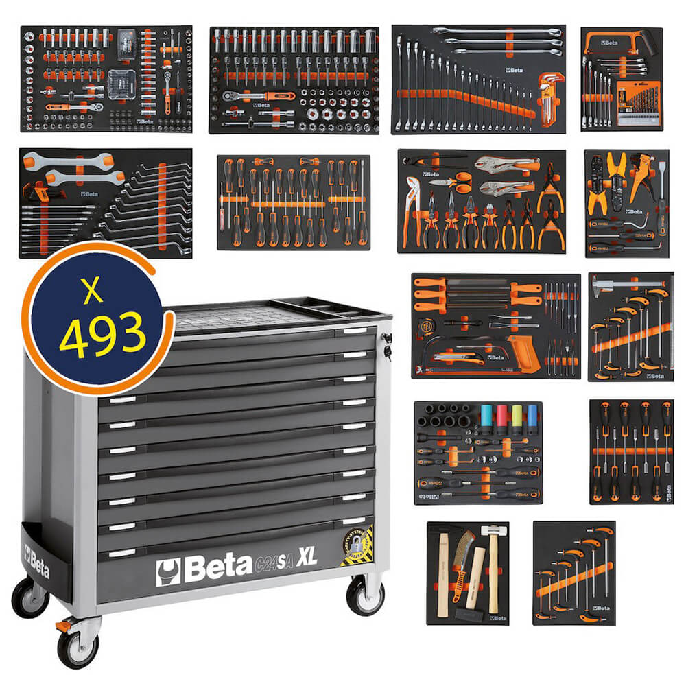 Professioneller Werkzeugwagen mit 9 kugelgelagerten Schubladen inkl. Teleskopführungen, Zentralverriegelung mit Sicherheitsschloss, Schubladenböden mit Schaumgummibelag, integrierter seitlicher Fläschchenhalter, Frontblende aus hochbeständigem Nylon, Arbeitsplatte aus hochbeständigem ABS, mit 6 Schalen zur Aufnahme von Kleinteilen uvm.
