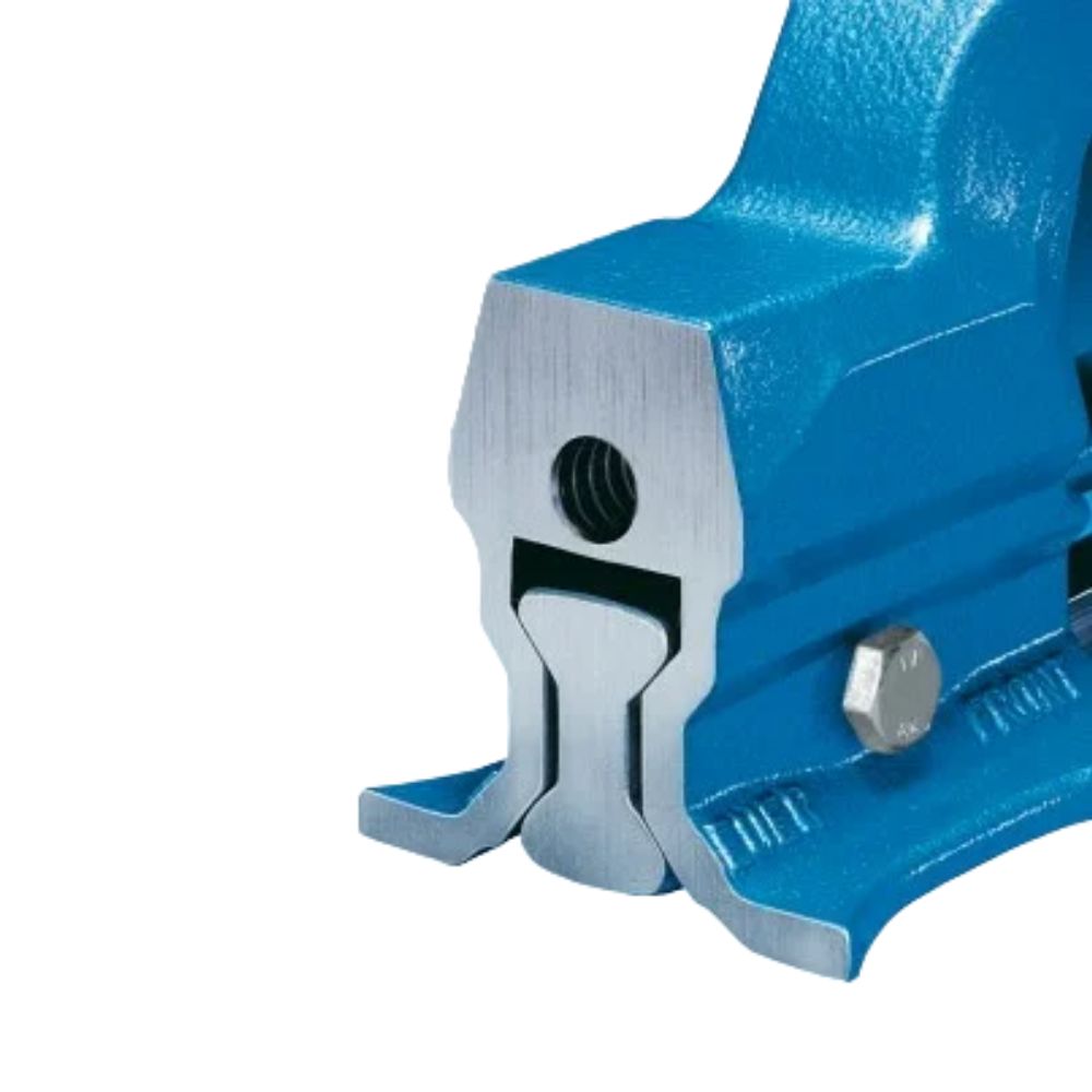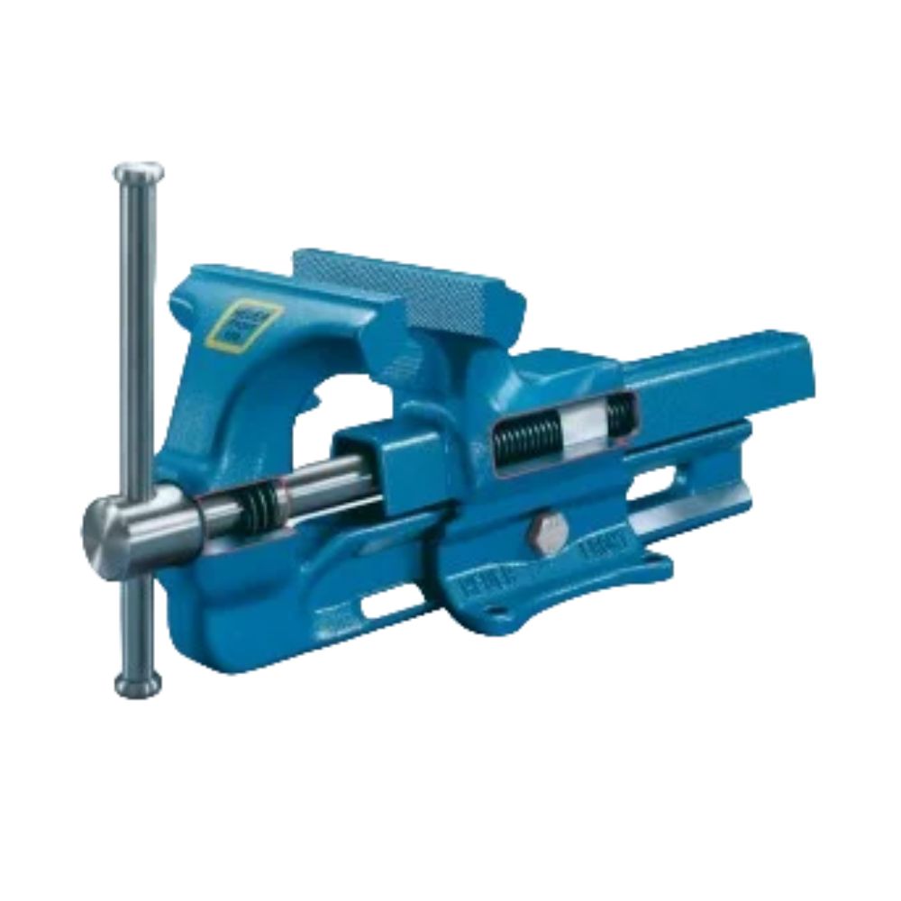 Parallel vice system HEUER. Forged entirely from steel, guaranteed unbreakable . Paint finish: hammered blue powder-coated. With forged pipe clamping jaws, large deep clamping option, protected precision spindle bearing and protected spindle with two-start trapezoidal thread, easily adjustable central guide, large guide surfaces machined on all sides guarantee precision and a long service life.