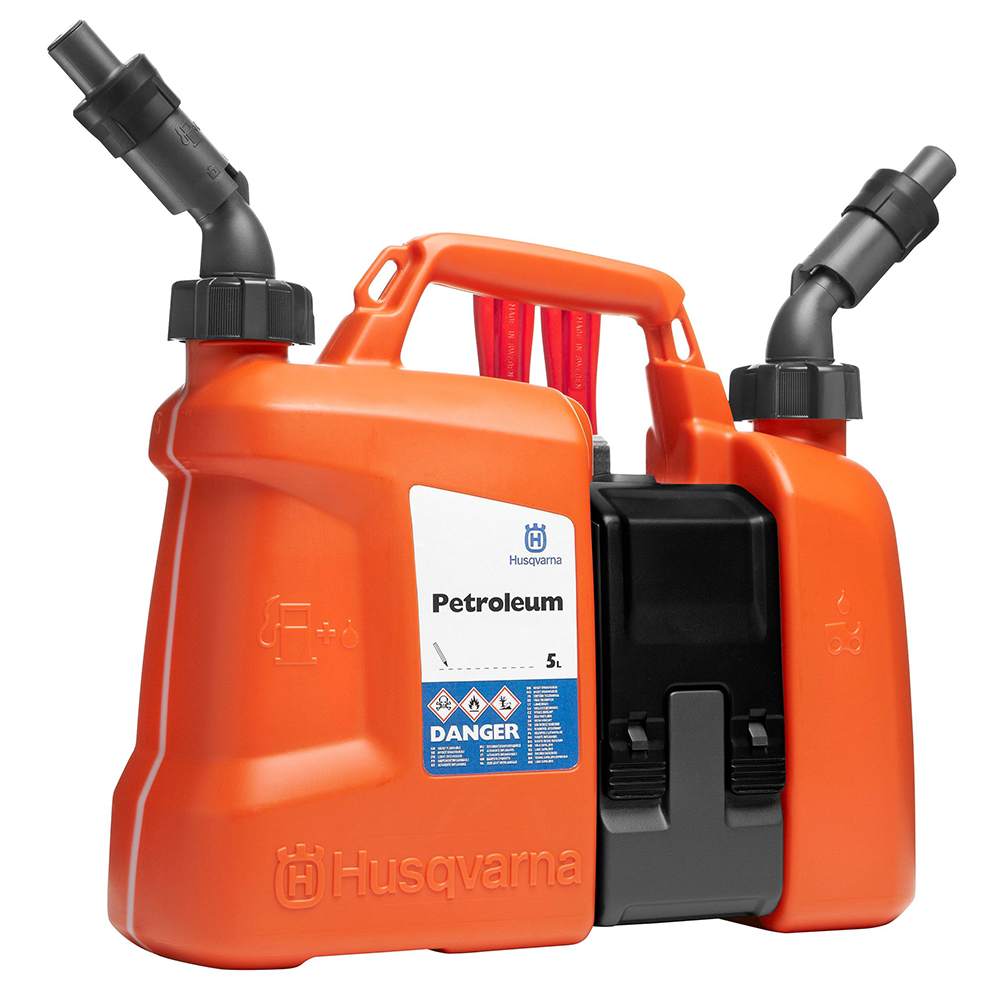 Mit dem verbesserten Husqvarna Kombikanister verschwendet man keinen Kraftstoff mehr durch lästige Spritzer. Die Größe des Kanisters wurde auf ein optimales Verhältnis zwischen Kraftstoff und Öl abgestimmt (5 l / 2,5 l). Durch die integrierte Werkzeugbox hat man häufig benötigte Werkzeuge und Ersatzteile immer dabei, wenn man sie benötigt.