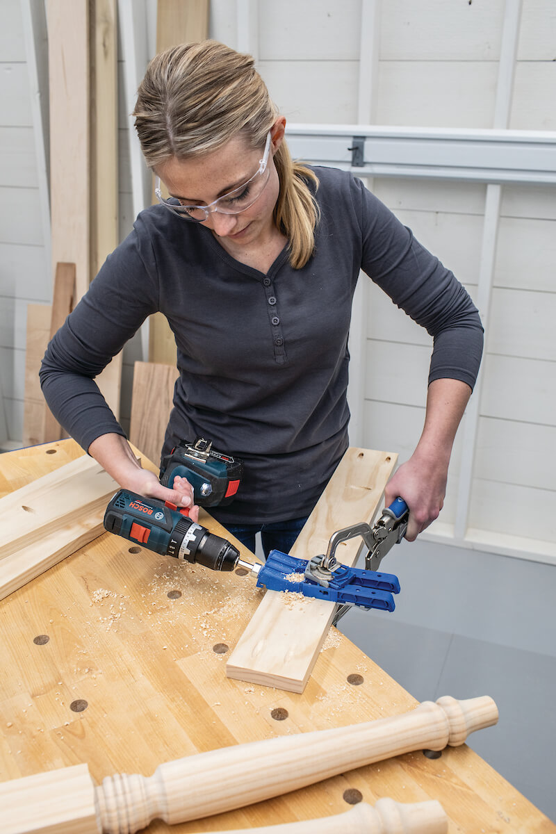 Die mitgelieferte Einstelllehre und der einfach einzustellende Bohrer erleichtern das Einrichten. Ein Anti-Rutsch-Belag auf der Unterseite verhindern das Verrutschen, während Sie jedes Mal perfekt positionierte Taschenlöcher bohren.
