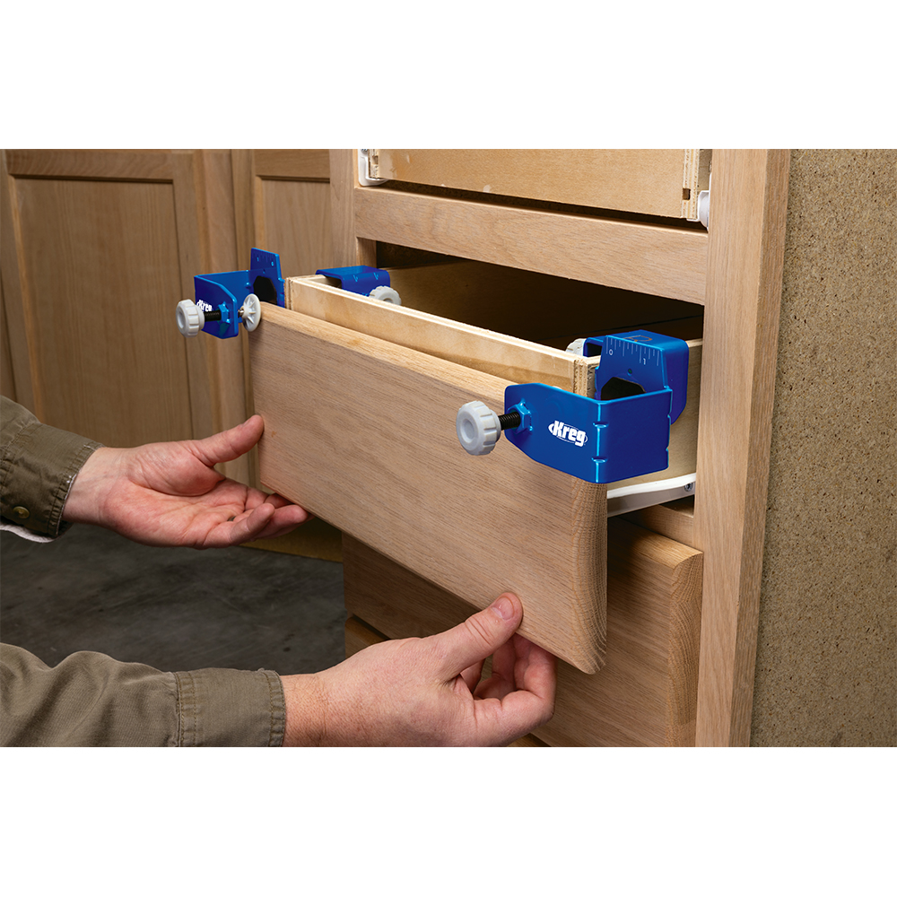 Dieser Montagesatz für Schubladenfronten ist das perfekte Werkzeug, um die Installation von Schubladenfronten zu vereinfachen. Klemmen, ausrichten und anbringen – in drei einfachen Schritten ist die Schubladenfront angebracht. Der Montagesatz für Schubladenfronten umfasst ein linkes und ein rechtes Schubladenmontagewerkzeug.