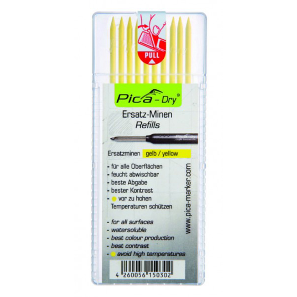 Pica DRY Ersatzminen● Für fast alle Oberflächen, egal ob trocken oder feucht, glatt oder rau, staubig oder ölig, hell oder dunkel ● Von glatten Flächen feucht abwischbar ● Minen bereits angespitzt ● in einer praktischen und robusten Kunststoffbox ● Inhalt farbrein: 10 gelbe Minen