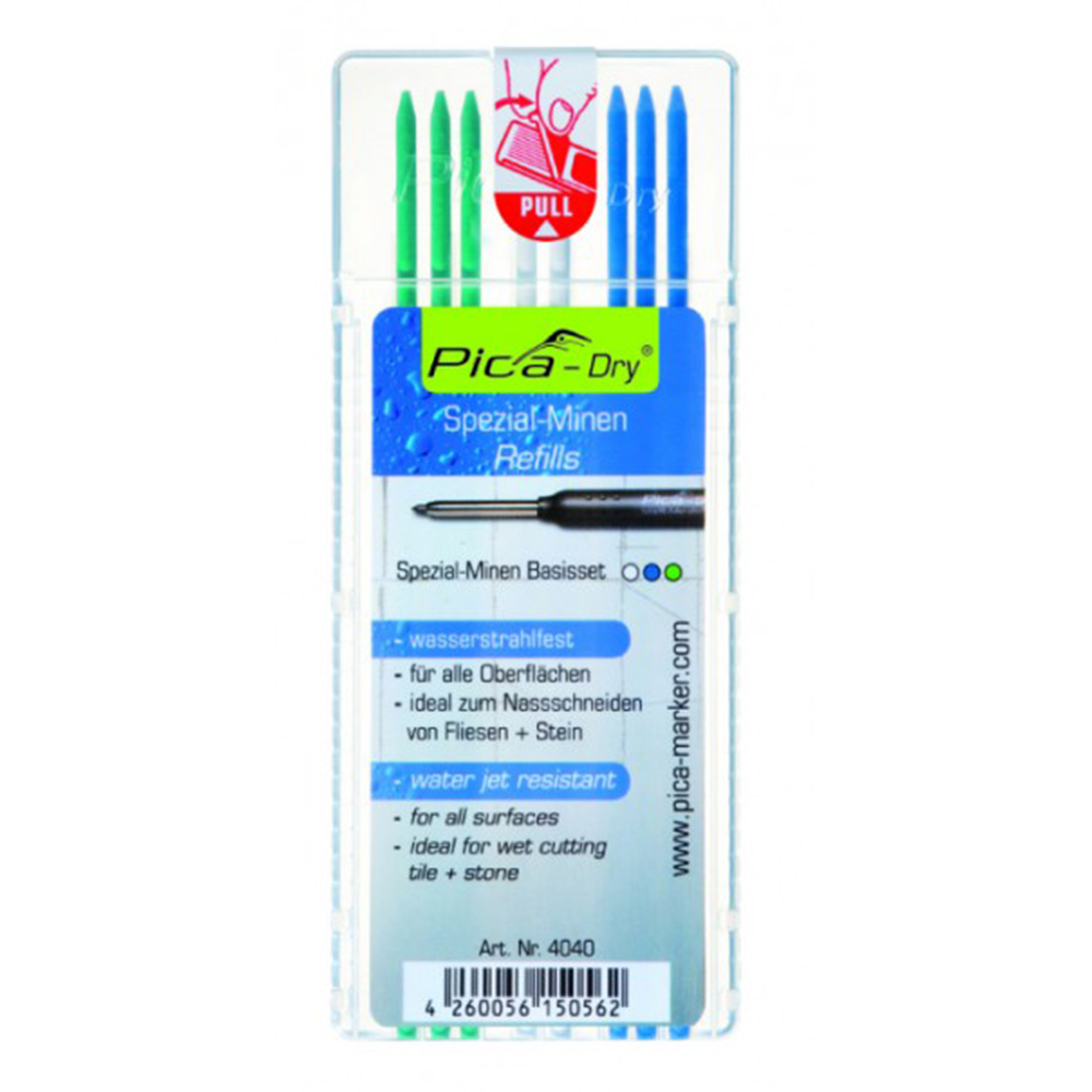 Pica DRY Ersatzminen● Blister-Packung ● Für fast alle Oberflächen, egal ob trocken oder feucht, glatt oder rau, staubig oder ölig, hell oder dunkel ● Von glatten Flächen feucht abwischbar ● Minen bereits angespitzt ● in einer praktischen und robusten Kunststoffbox ● Inhalt sortiert: 4 x 4030 Graphit ; 2 x 4031 rot ; 2 x 4032 gelb