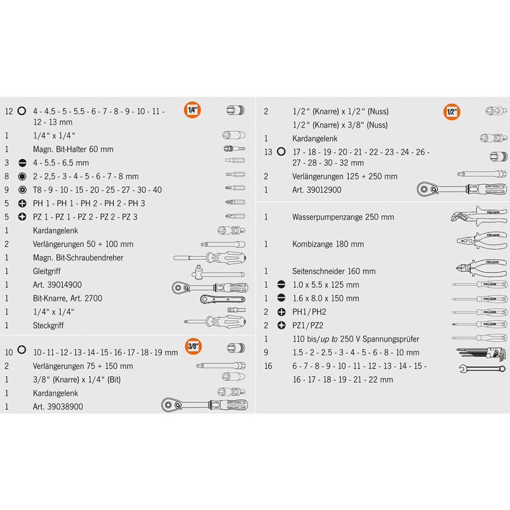 - Werkzeuge passgenau eingebettet in Schaumeinlagen mit attraktiver metallischer Oberflächenoptik