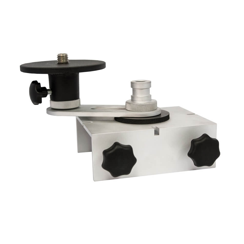- Halterung mit flexibler Führungsschiene ermöglicht schnelles Positionieren und exaktes Ausrichten des Messgerätes über einem Referenzpunkt, zum Beispiel beim Übertragen von Achsen auf der Baustelle – drehbar um 360°, verstellbar um 7 cm.