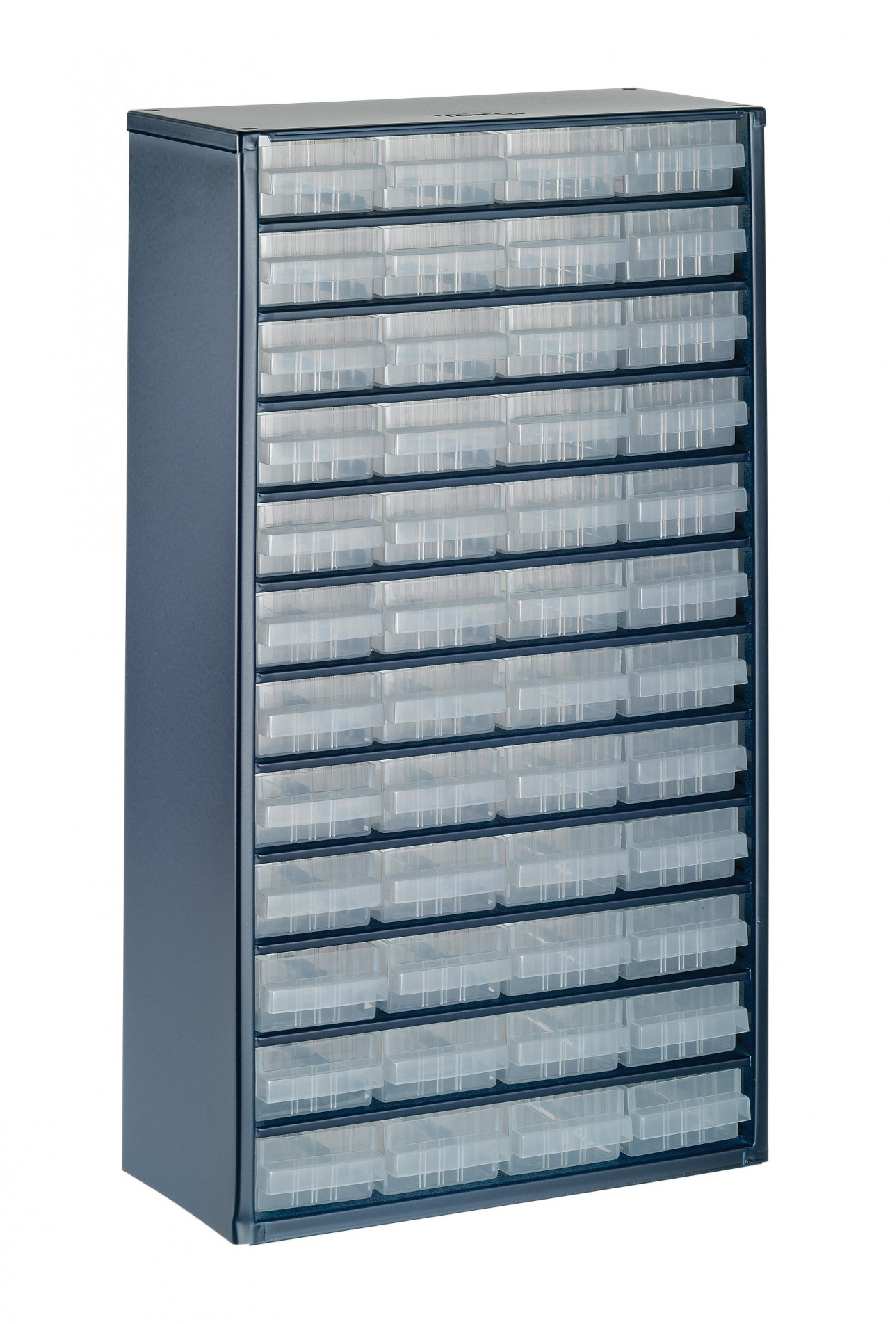 Hochwertiges Schubladen-Magazin mit 48 Schubladen Typ 150-01. Jede Schublade kann mit Trennwänden (als Zubehör erhältlich) in 16 Fächer unterteilt werden.Hergestellt aus Stahl, Schubladen aus PP.