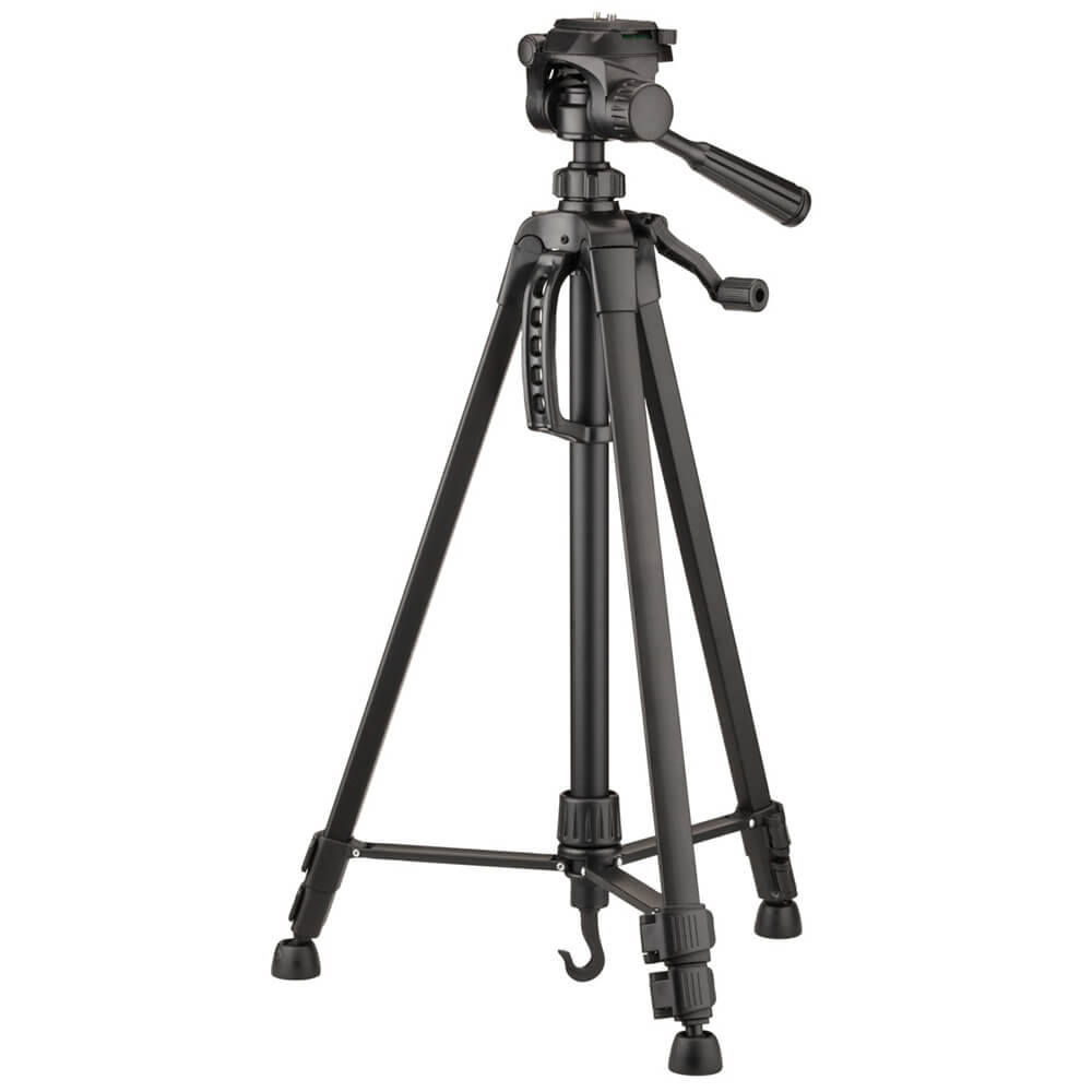 Stativ mit Spreizschutz und Kurbelsäule. Mit der Kurbelsäule können Laser exakt auf eine gewünschte Arbeitshöhe positioniert werden. Höhenverstellbar von 55 cm bis 140 cm. Stativbeine mit Gummikappen. 1/4″-Gewindeschraube.