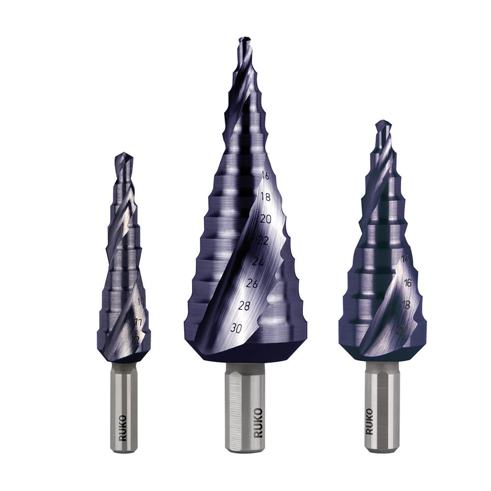 Stufenbohrer-Satz HSS-TiAlN spiralgenutet in den Größen 0/9, 1, 2 in ABS-Kunststoffkassette – 3 tlg.