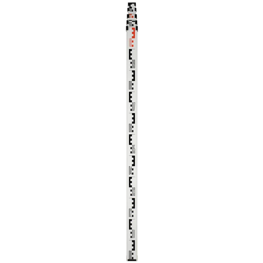 Eloxierte Aluminium-Teleskop-Messlatte für den Einsatz beim Nivellieren über große Distanzen im Zusammenspiel mit optischen Nivelliergeräten und Lasern. Fernsichtskala mit E-Teilung, Rückseite mit mm-Teilung. Ausziehbar bis 500 cm (Transporthöhe: 124 cm).